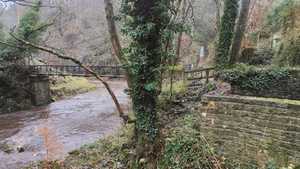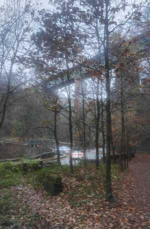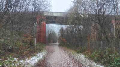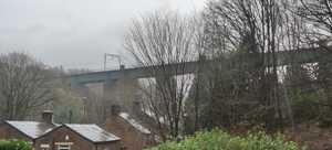 The NCN 62 comes out under the Broadbottom Viaduct, which spans over a hundred metres and its height, in technically terms, is well tall. It's quite spectacular straddling a steep ravine. Here, you cross over the water, and turn left down a small track.