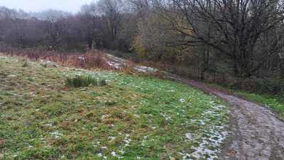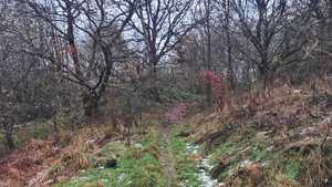 You cross the fort, and a path on the right trails into the woods. It meets another bridleway which heads South towards Glossop Road. Here, there is plenty of woodland on either side, and abundant ivy gives it a rich green texture.
