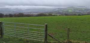 The path here snakes over fields with views over the Peak District and Glossop. Part way over, you meet another road, turn left and take the footpath on the right. In heavy rain, this path can be boggy, but it is passable.
