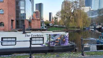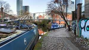 The area after Old Trafford is Pomona. Here, Manchester's skyline starts to loom over the canal. You can see new glass towers, and plenty of old brick conversions. The Metrolink running parallel provides a literal comparison between the modern and old way of travelling.
