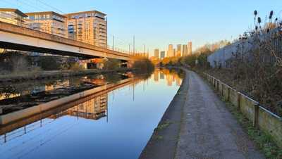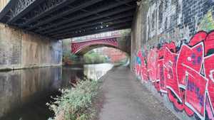 This stretch passes the freight yard of Manchester's freight rail station. You will shortly come to Throstle Nest Bridge, which you need to cross to continue down the canal.